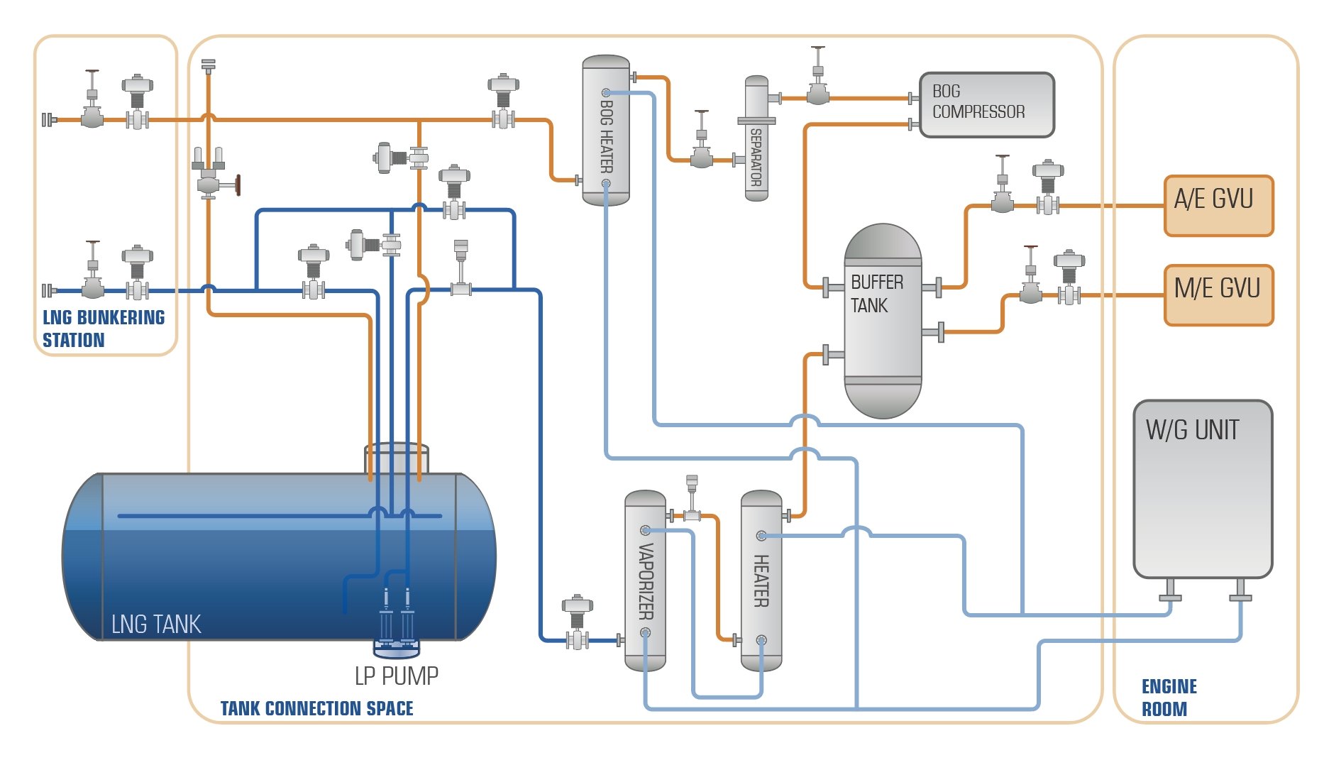 整個(gè)氣體工藝包采用定制化開發(fā)/模塊化設(shè)計(jì),可根據(jù)船舶布置實(shí)現(xiàn)布局的最優(yōu)化。天然氣經(jīng)中間介質(zhì)加熱,降低天然氣與熱源之間的交叉泄漏風(fēng)險(xiǎn),同時(shí)確保在不同航區(qū)不同環(huán)境條件下供氣系統(tǒng)和加熱單元的靈活性和穩(wěn)定性。